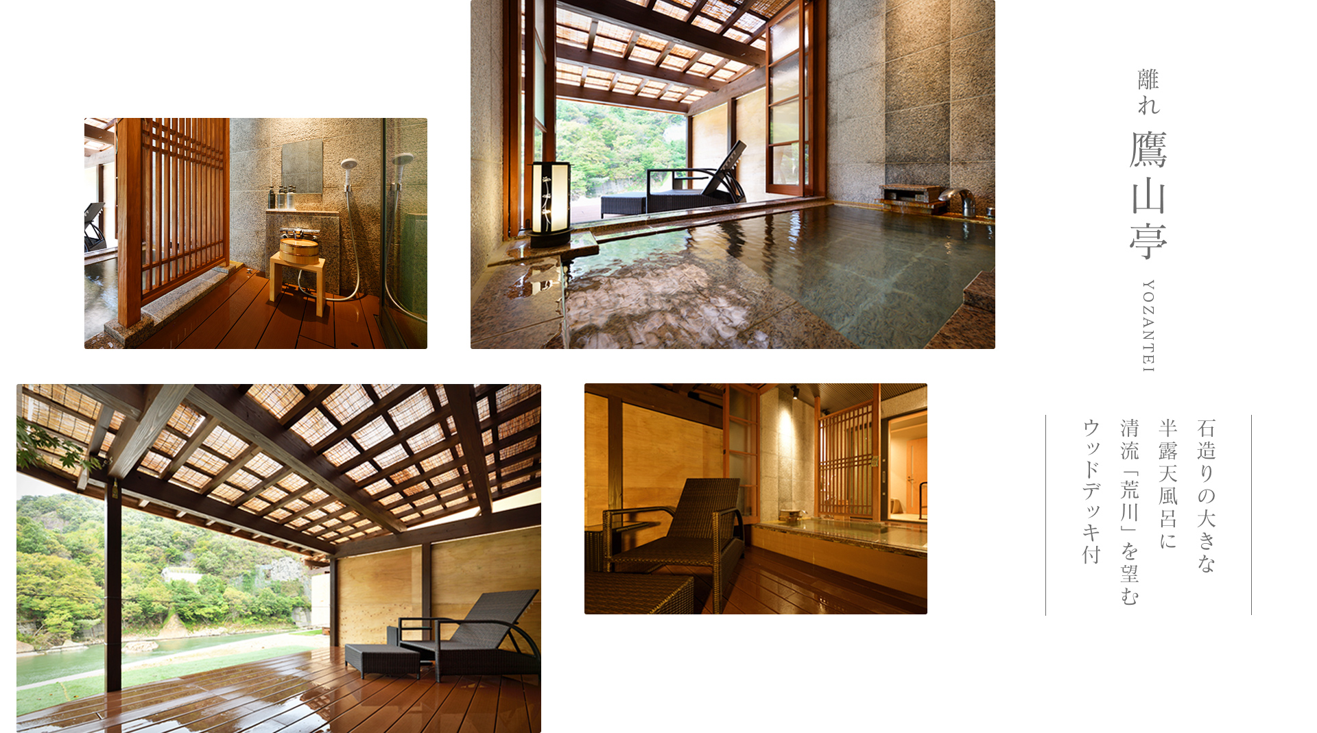 - 源泉掛け流しで注ぐ石造りの大きな半露天風呂を備えた離れ【鷹山亭(ようざんてい)】。湯船からつづくウッドテラスの先には、清流・荒川が流れる雄大な自然が広がります。春夏は瑞々しい緑、秋の紅葉、冬は雪景色。四季折々に移ろう景色を温泉とともにお愉しみください。