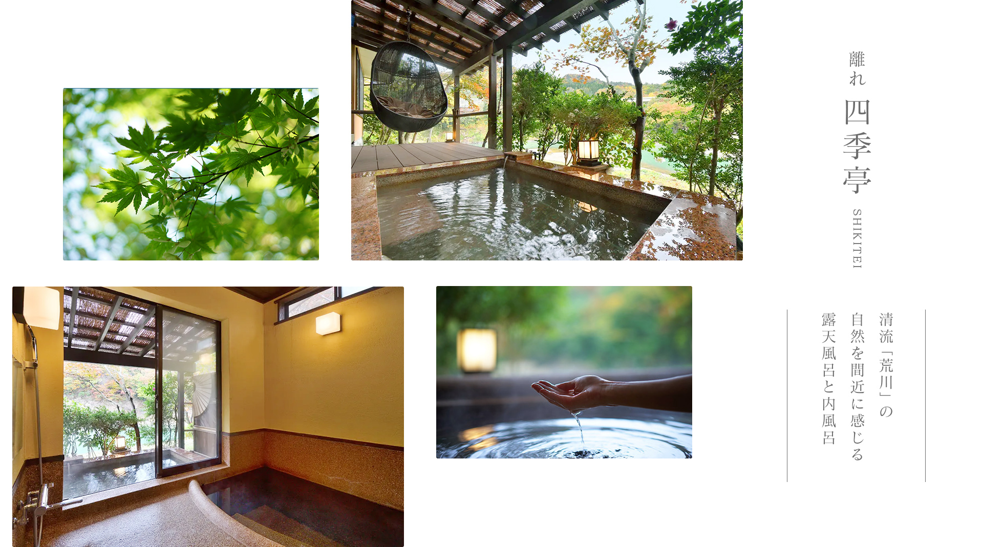 - 源泉掛け流しの内風呂と露天風呂を備えた離れ【四季亭(しきてい)】。清流・荒川の雄大な自然を間近に感じる露天風呂にはウッドテラスも完備し、四季折々に移ろう景色をのんびりと眺めてください。