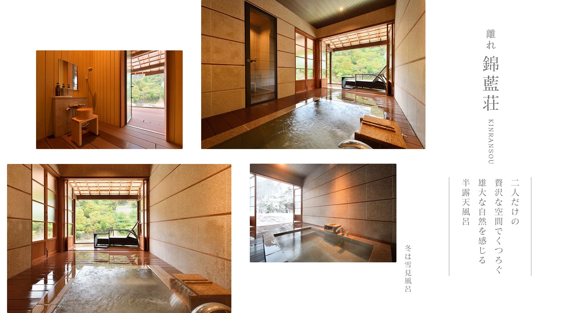 - 露天風呂、別邸 喜澄客室「春蘭、土筆、雪下」、離れ客室「四季亭、錦藍荘、鷹山亭、和楽荘、喜楽荘」