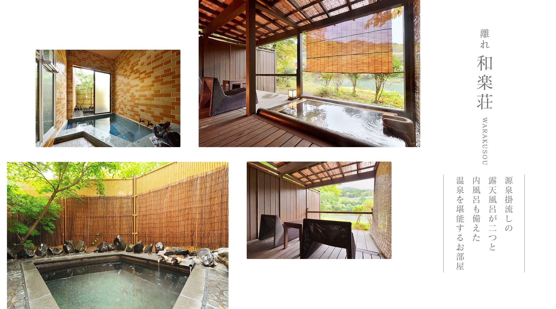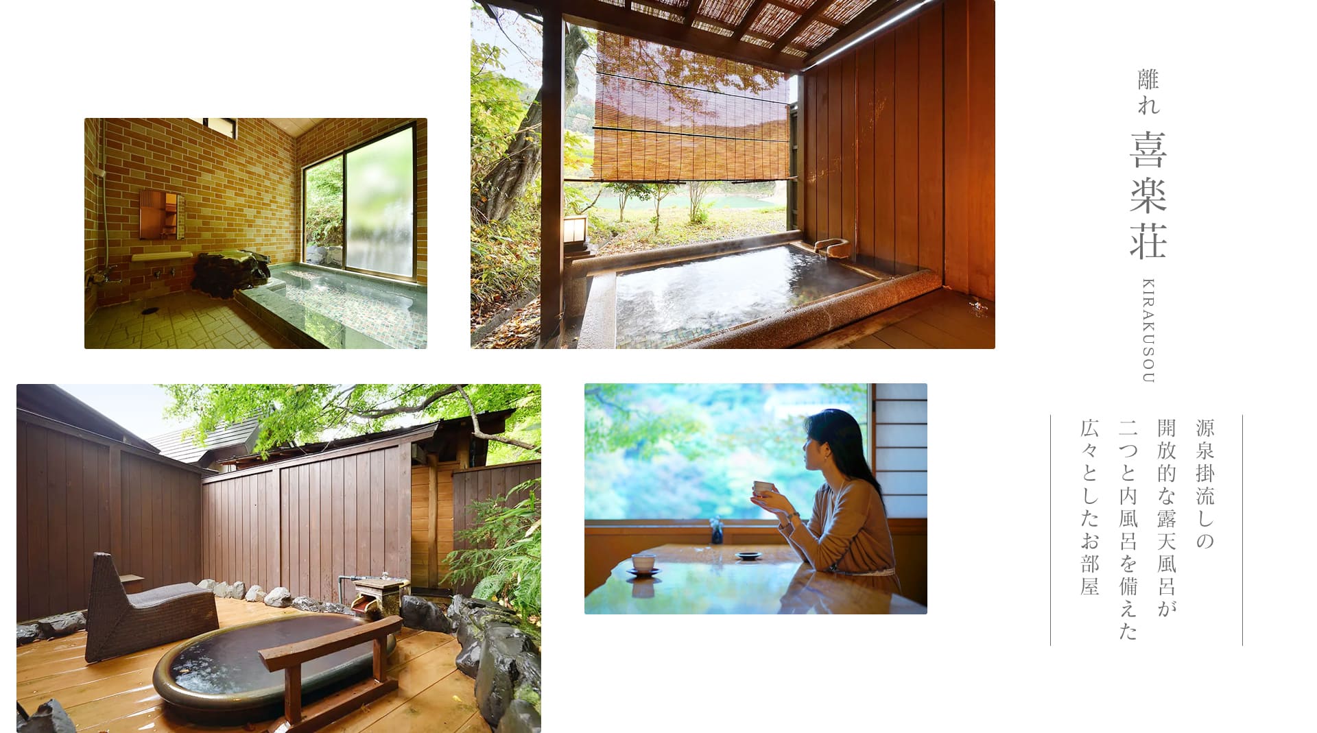 - 開放感溢れる二つの専用露天風呂に加え、内風呂を備えた【離れ 喜楽荘(きらくそう)】。二世代での家族旅行やグループでのご宿泊にも適した、使い勝手の良い離れタイプです。ウッドデッキを備えた露天風呂からは、四季折々に表情を変える雄大な自然を間近に感じます。