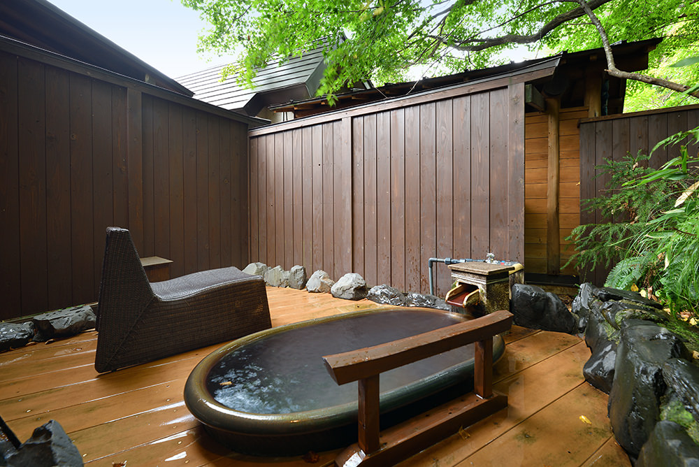 二つの専用露天風呂で大人数でのご宿泊に便利 開放的な二つの専用露天風呂を備えており、二世代でのご旅行やグループでのご宿泊に便利にご利用いただけるお部屋です。開ウッドデッキ付の露天風呂は、四季の自然が間近に感じていただけます。もう一つの露天風呂は、かわいらしい陶製となりますす。お食事は夕食・朝食ともにダイニングテーブルにご用意いたしますので、足腰の悪い方やお年寄りの方でも安心してお食事をお楽しみいただけます。