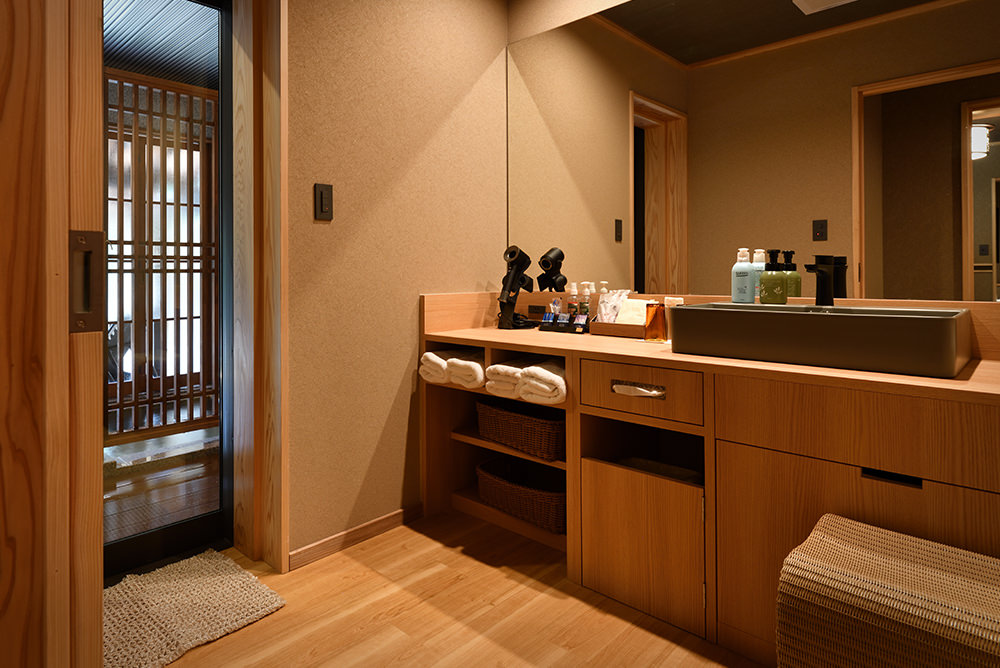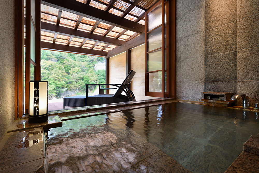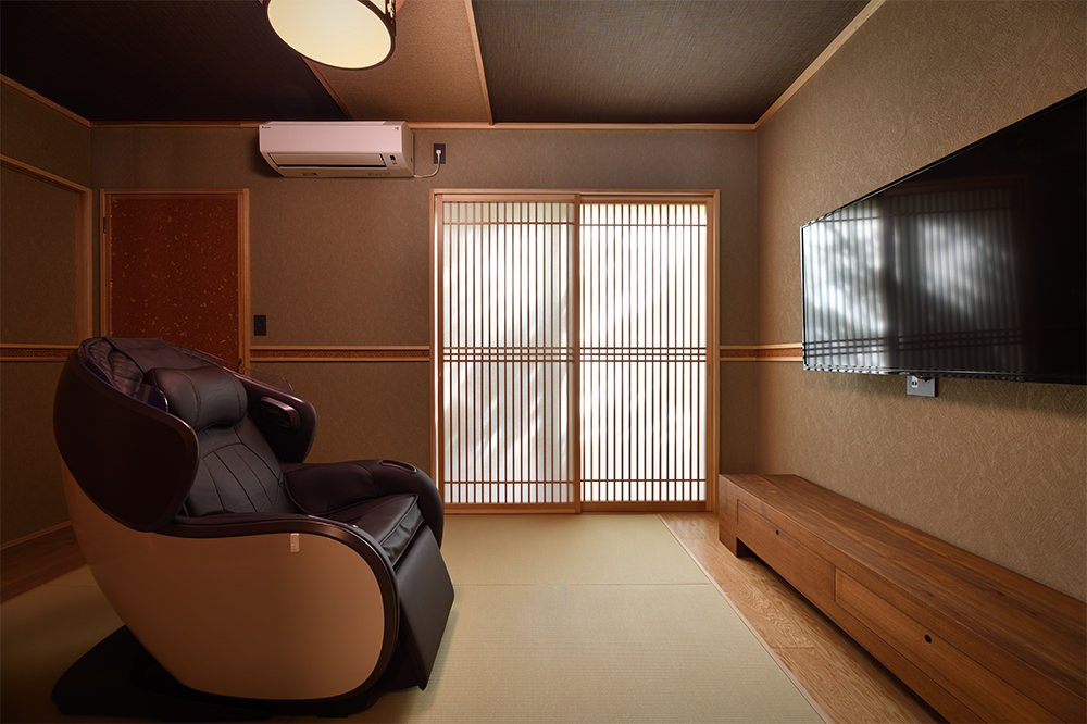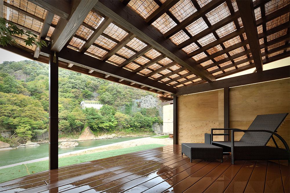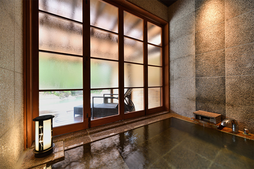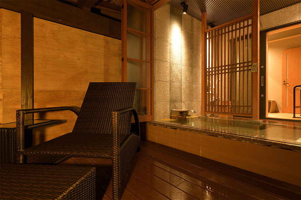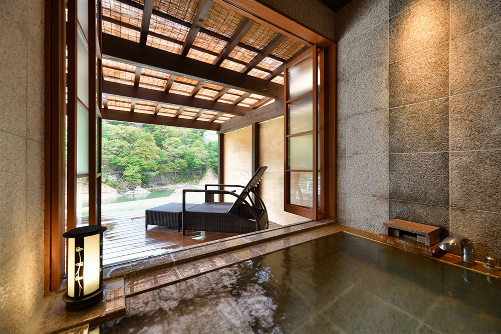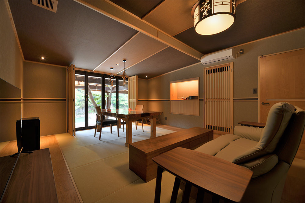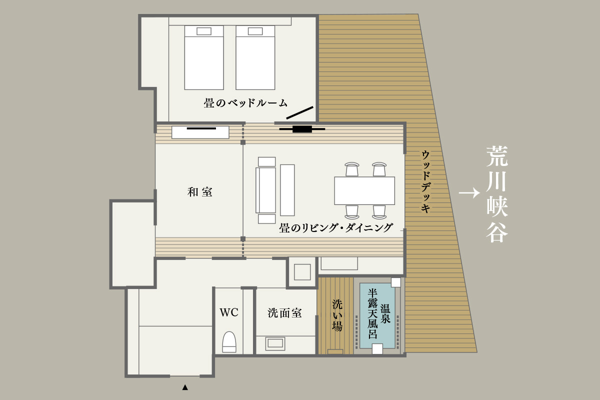 畳敷きの広いリビング・ダイニングと大きな半露天風呂の離れ セミダブルサイズのツインベッドルームに加えて布団敷きの和室を備えており、4名様でご利用いただけるお部屋です。客室専用の半露天風呂は大きな開閉窓を備え、清流「荒川」の流れる雄大な渓谷風景を眺めていただけます。石造りの大きな湯船に源泉掛け流しで注ぐ「鷹ノ巣温泉」の湯を存分にお楽しみください。広いリビング・ダイニングは素足に心地よい畳敷き。お食事は夕食・朝食ともに4名様掛けのダイニングテーブルにご用意いたします。静かな離れ客室で、皆様での寛いだひと時をゆっくりとお過ごしください。