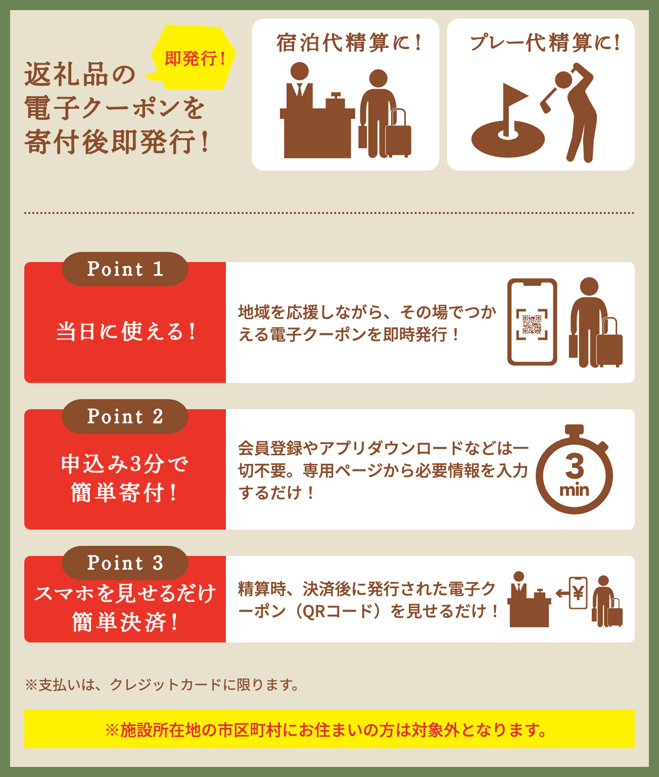 ※決済済みの金額(ご宿泊事前決済)にはご利用できません。現地でのご利用分のみ(お飲み物代など)にはご利用いただけます